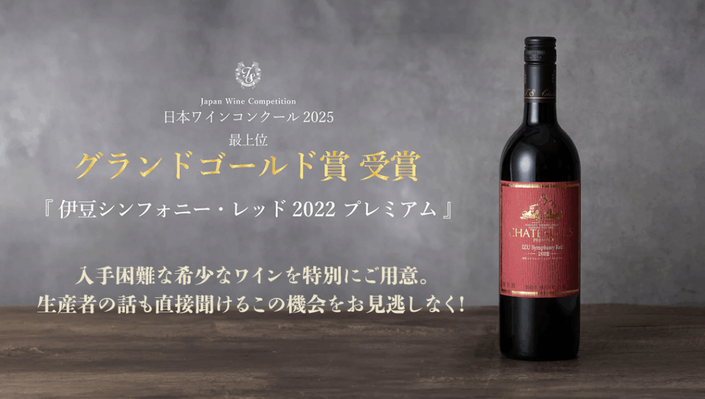 なかでも注目は、日本ワインコンクール2025で最高位「グランドゴールド賞」を獲得した、中伊豆ワイナリーの《伊豆シンフォニー・レッド プレミアム 2022》。