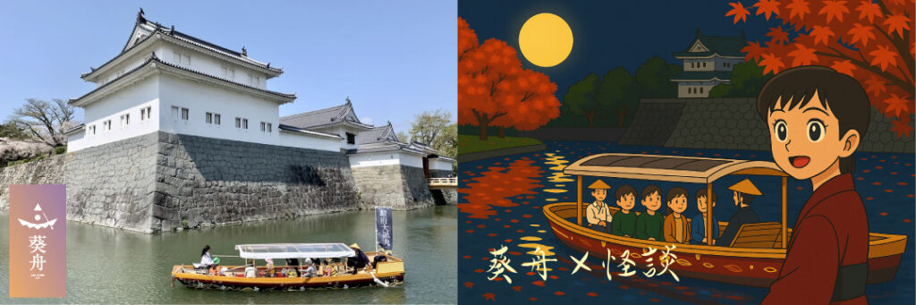- 悪天候の場合は、葵舟の運航を中止いたします。その際は、紅葉山庭園にて「怪談」をお楽しみいただきます。